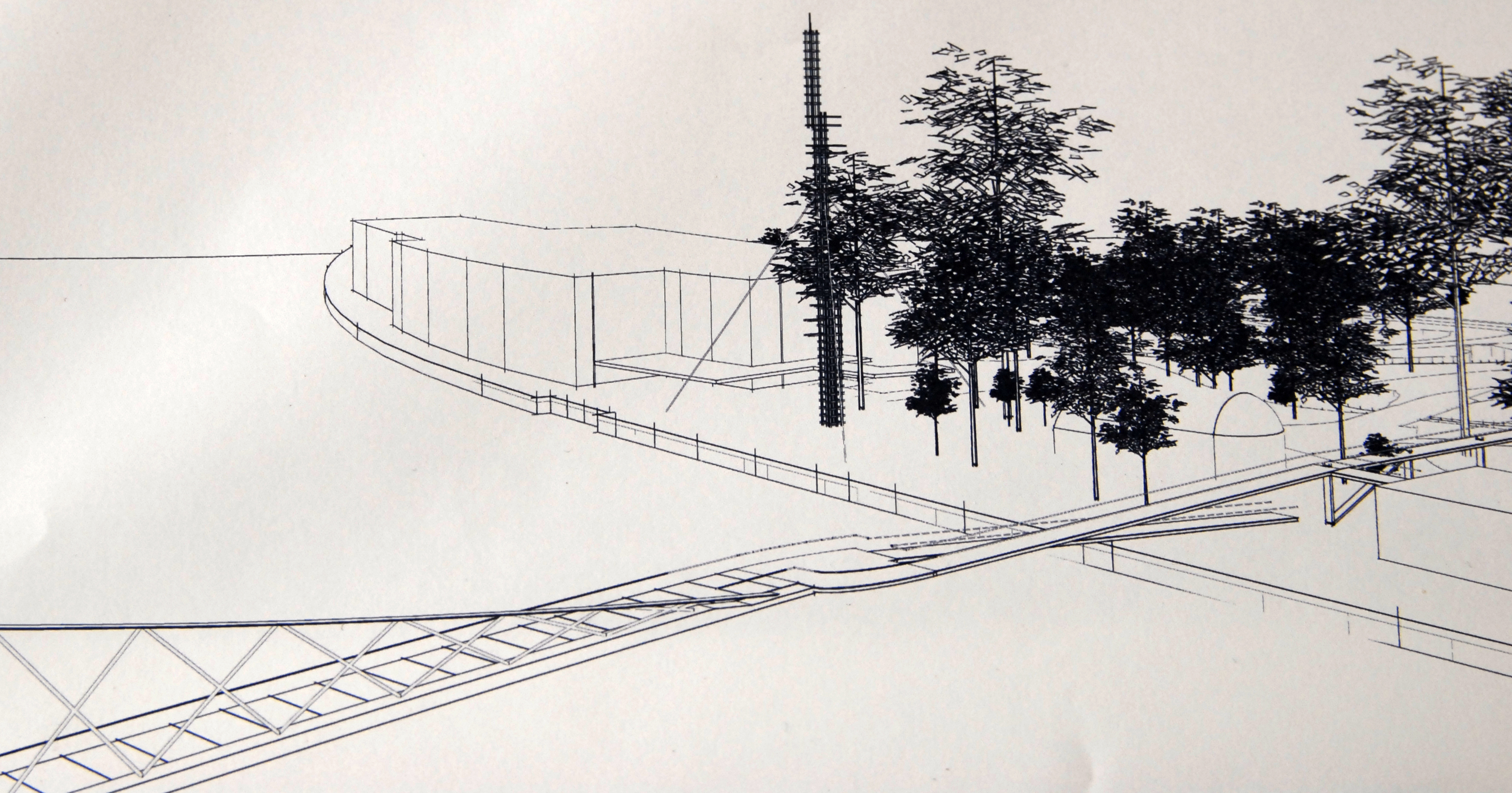 - La partie la plus importante de la passerelle (jusqu’au « nœud » central qu’on observe sur le plan) est suspendue à un pylône (oblique, penché vers la Meuse, sans doute haut d’une bonne vingtaine de mètres) situé en rive gauche (pas de pylône en rive droite pour ne pas abîmer la vue sur la Tour Schöffer). Au niveau de ce nœud, la passerelle se divise en deux parties : l’une redescend jusqu’au RAVeL (pente : 9%), l’autre continue jusqu’à la rue du Parc, en traversant de part en part le Parc de la Boverie (avec une liaison éventuelle au toit du bâtiment du RCAE ; qui doit devenir annexe du CIAC). En dépit de plusieurs questions dans ce sens, ni les auteurs du projet ni le maître de l’ouvrage n’ont souhaité s’exprimer sur le problème que pose l’implantation de la passerelle dans un site classé.