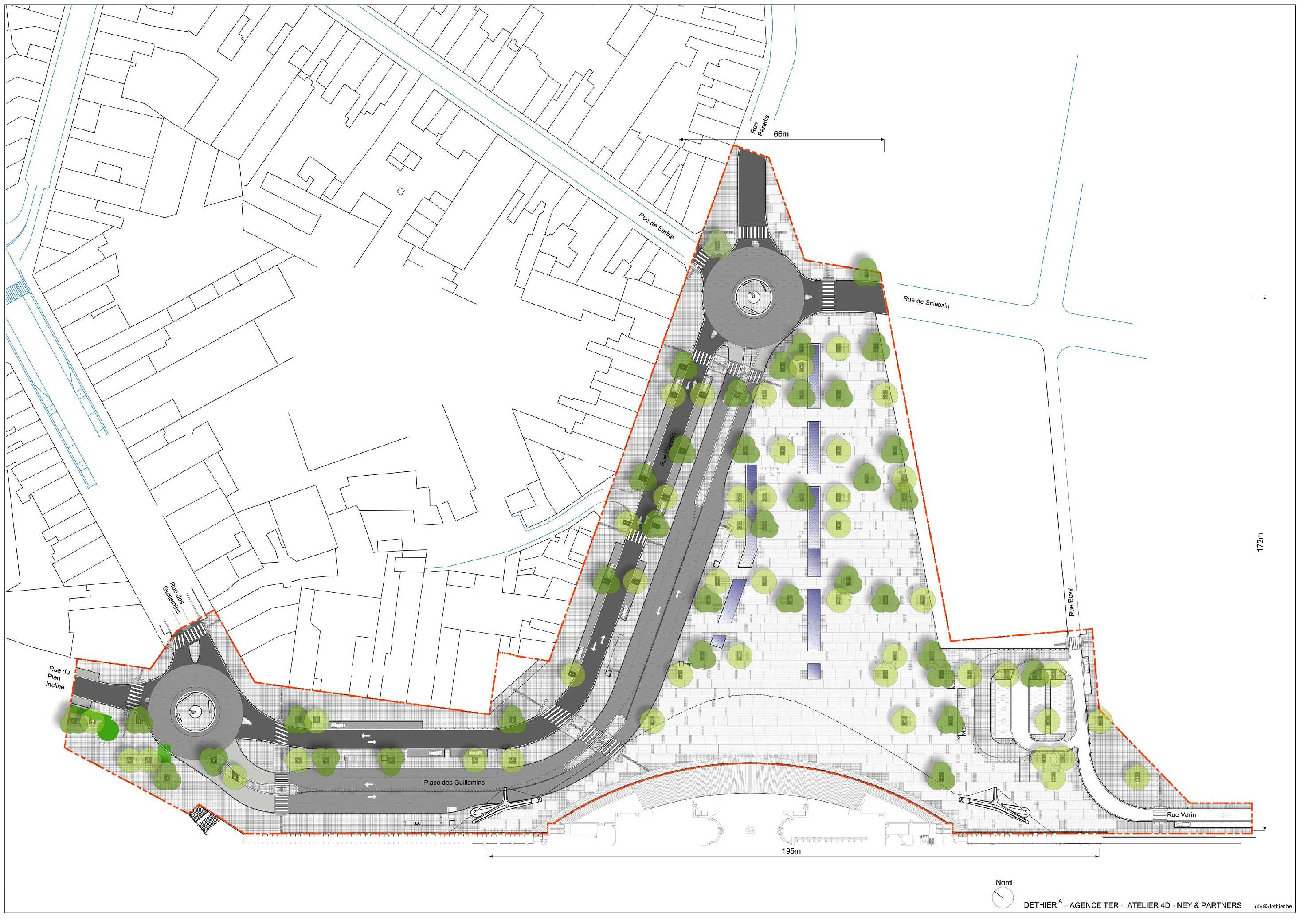 On notera l’expropriation des immeubles formant le coin de la place des Guillemins et de la rue Paradis, la présence de « baignoires » sur la place (une référence ironique au canal calatravien ?), l’espace pour les taxis du côté de la rue Varin,...